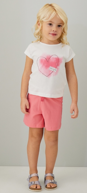 Completo bimba estivo in jersey di cotone stretch composto da t-shirt a mezza manica azzurra con scritte bianche e strass e gonna a balze bianca a fantasia fiori azzurri e celesti con pantaloncino attaccato e con comodo elastico in vita.
