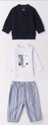 Completo baby maschio elegantino composto da cardigan in felpa stretch garzata primaverile blu, pantalone in tessuto a righe bianche e celesti con pratico elastico in vita e t-shirt a manica lunga bianca con applicazione orsetto a righe celesti in abbinamento.