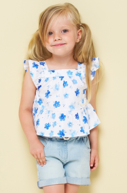 T-shirt bimba a mezza manica in jersey di cotone stretch bianco con stampa farfalle celesti, dettagli glitter, fiorellini organza e fiocco strass.