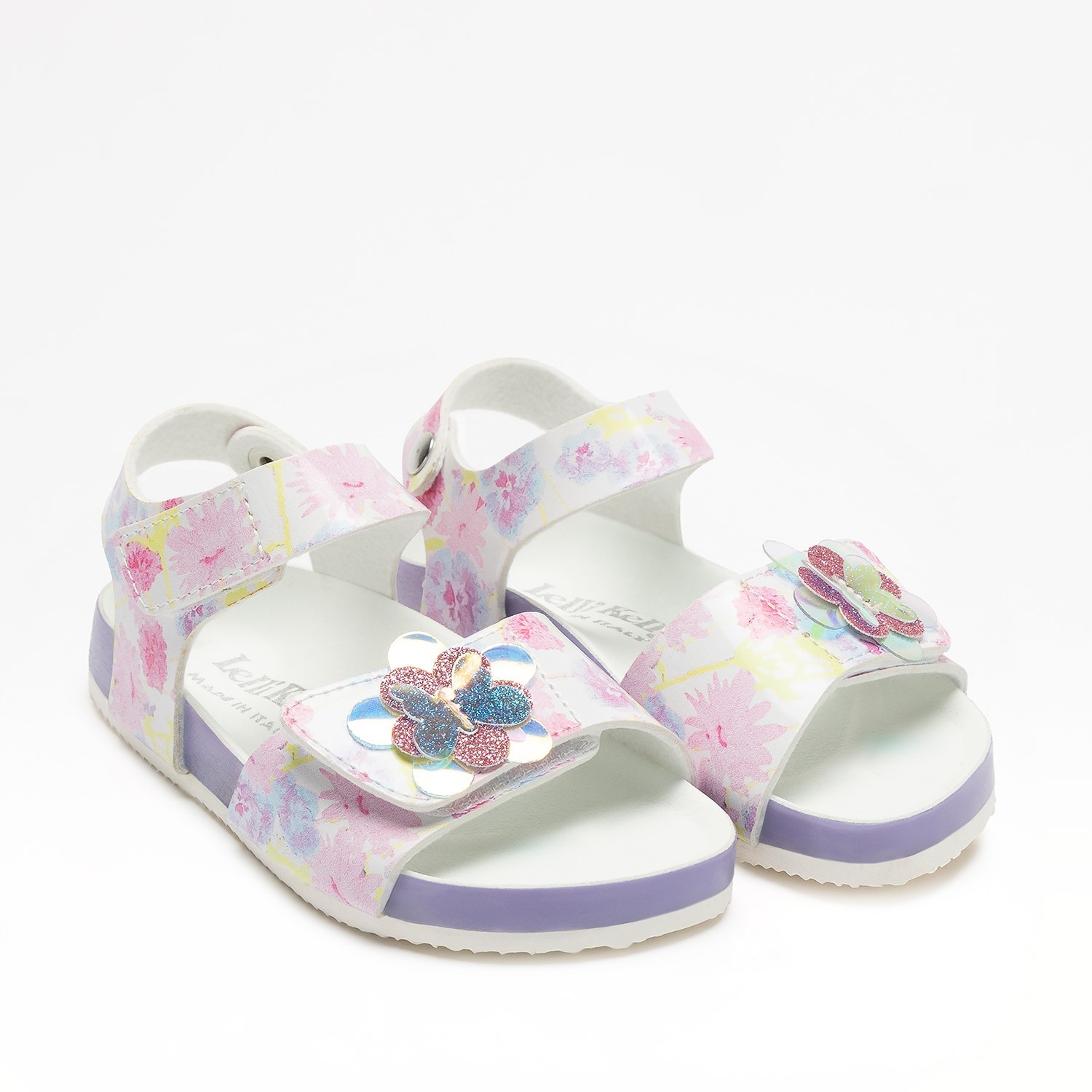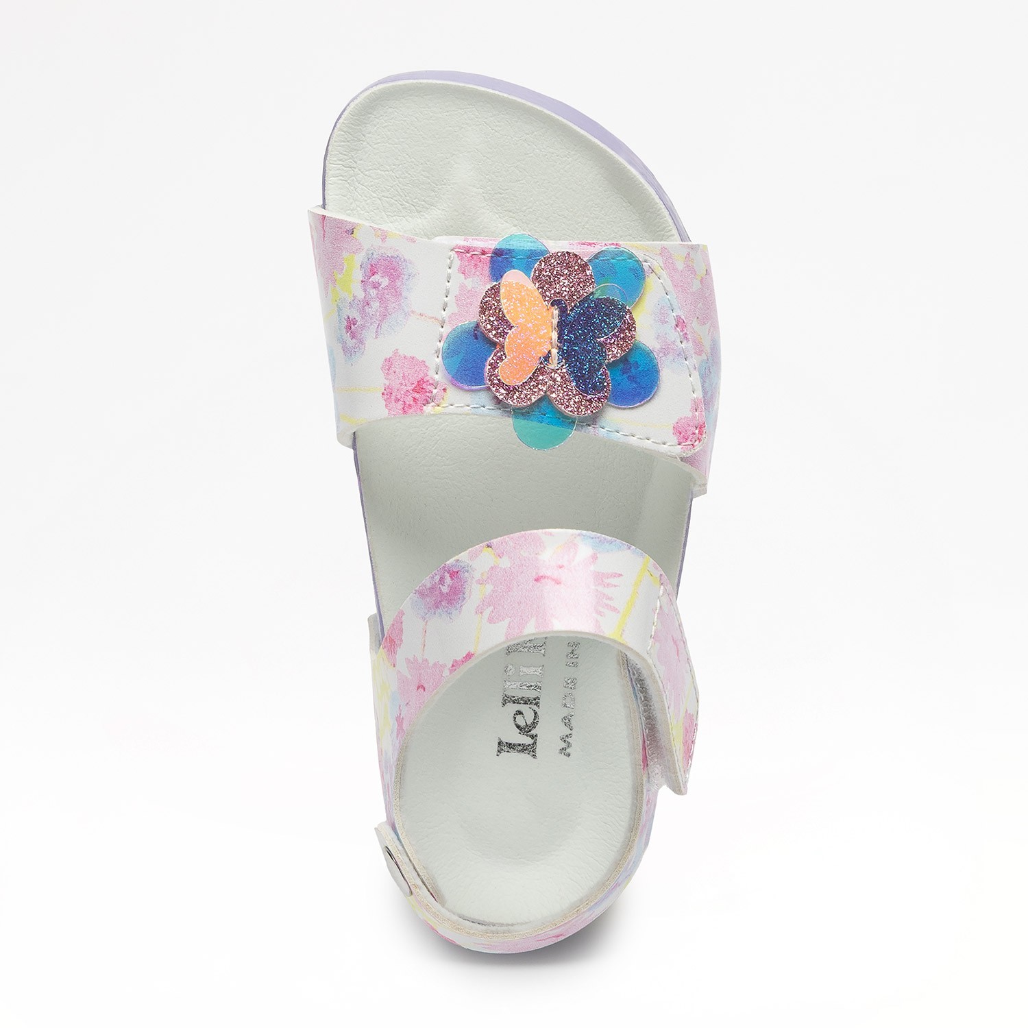 Sandalo bimba in vernice a fantasia fiori multicolor nei toni pastello con fiore rosa glitter e fondo anatomico con sottopiede in vera pelle. Con pratica chiusura a strappo e fascia regolabile.
