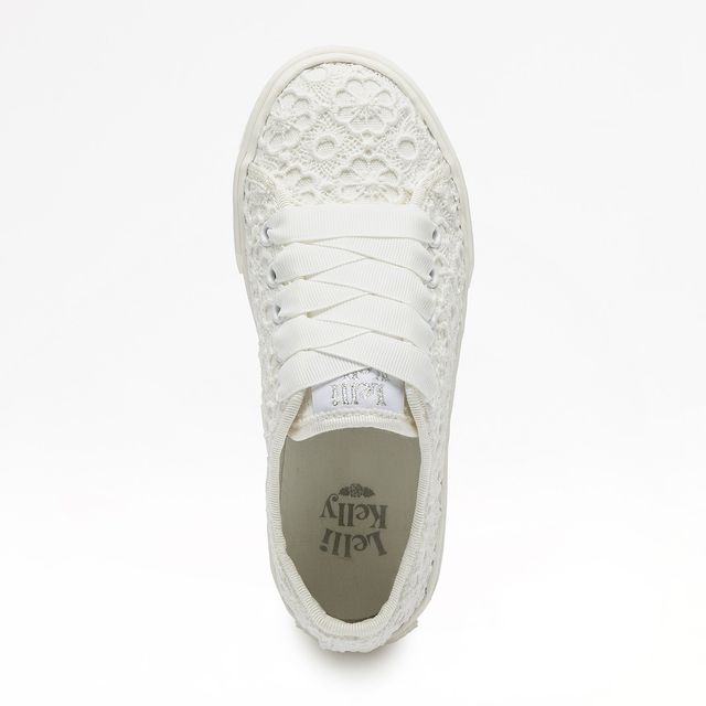 Sneaker bimba in pizzo macramè bianco con lacci tessuto. Sottopiede e fodera in cotone, suola antiscivolo dal design esclusivo e morbida imbottitura sulla caviglia. Nella confezione è fornito anche un laccio classico. Con ogni paio di scarpe in omaggio il braccialetto.