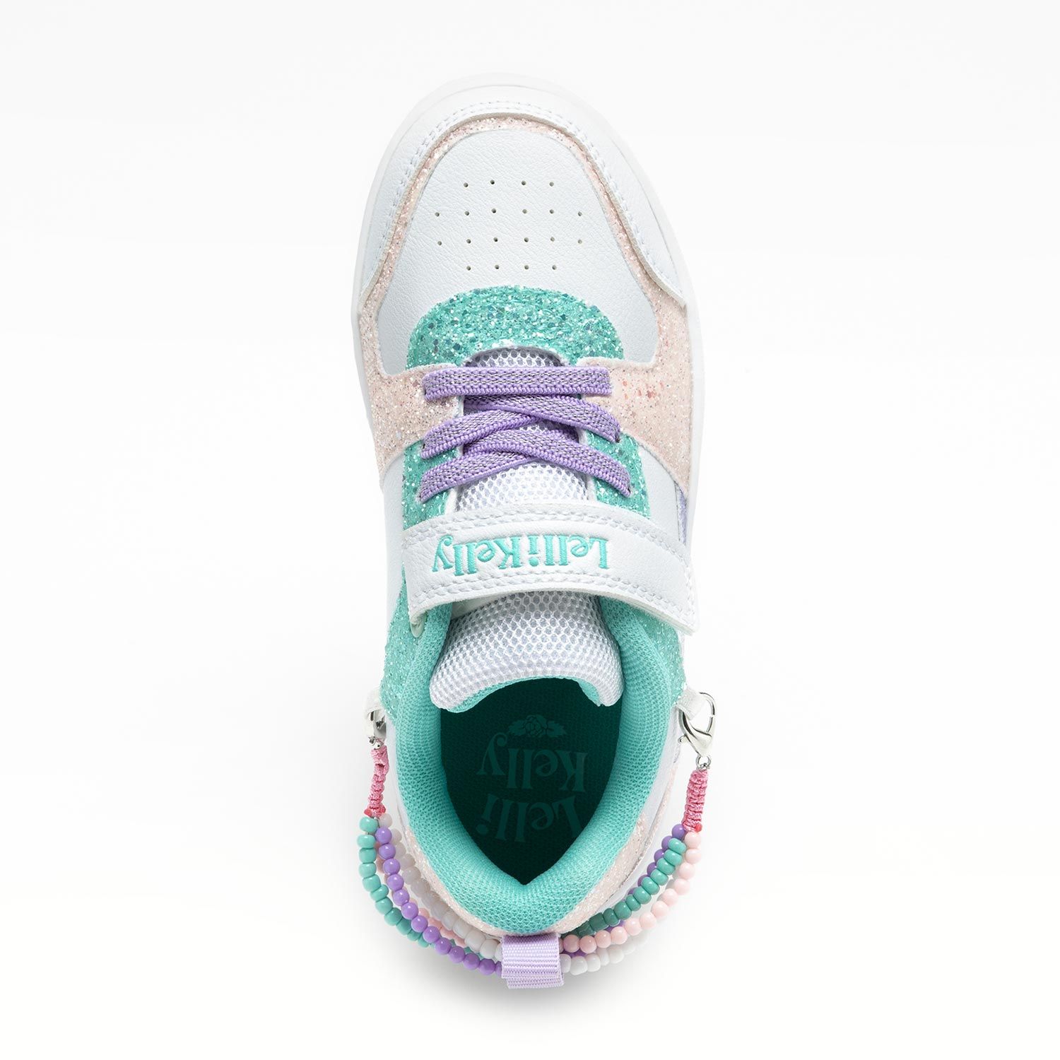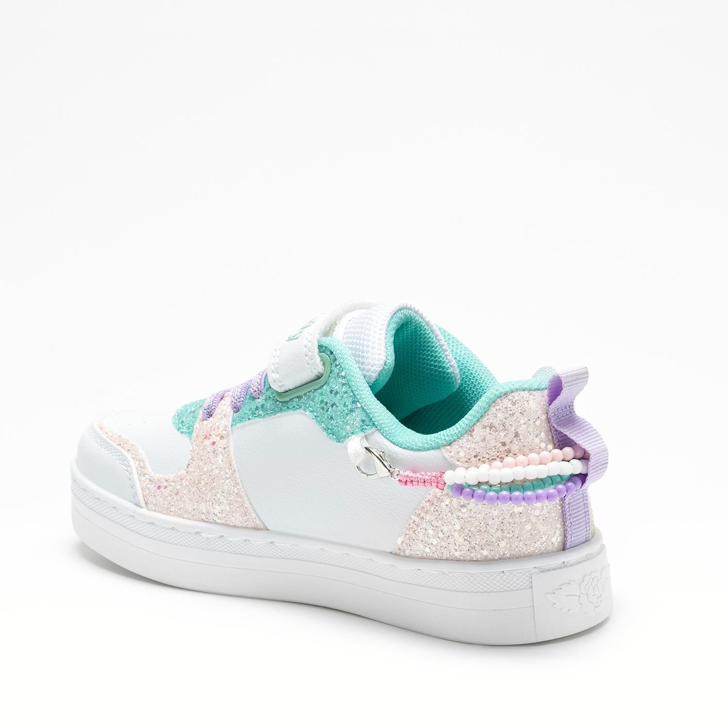 Sneaker bimba in materiale tecnico bianco con inserti in scintillante glitter rosa e verde mare e decorazione braccialetto con perline. Pratica chiusura velcro+lacci elastici con suola leggera cucita con battistrada antiscivolo. Accessorio speciale braccialetto da indossare sulla scarpa o al polso. Per ogni paio di scarpe acquistate in omaggio un grazioso braccialetto.