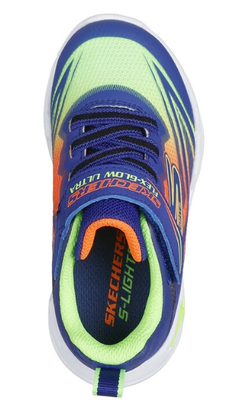 Sneaker baby con velcro e lacci elastici realizzata in mesh sfumato azzurro, arancio e verde fluo con led luminosi nella suola. Suola flessibile e comoda soletta ammortizzata.