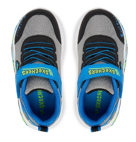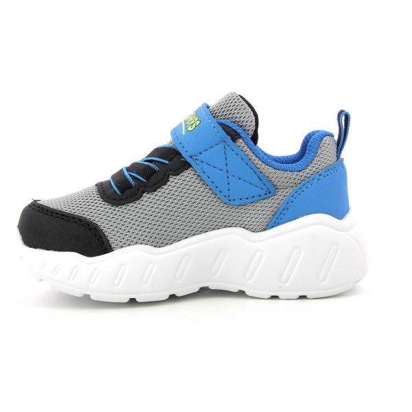 Sneaker baby con velcro e lacci elastici realizzata in mesh grigio con riporti neri e turchesi e simpatica intersuola con disegni animali della giungla. Comoda soletta ammortizzata. Lavabile in lavatrice.