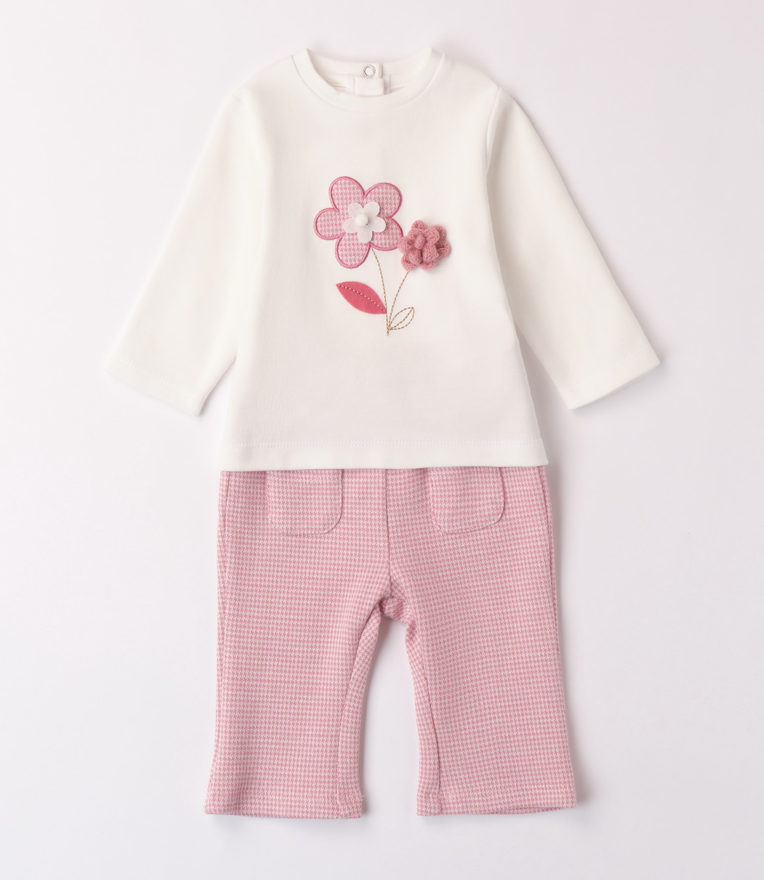 Completo baby femmina in caldo cotone composto da t-shirt color latte con applicazioni fiori rosa e pantalone rosa lavorazione spinata modello leggermente “a zampa” con comodo elastico in vita.