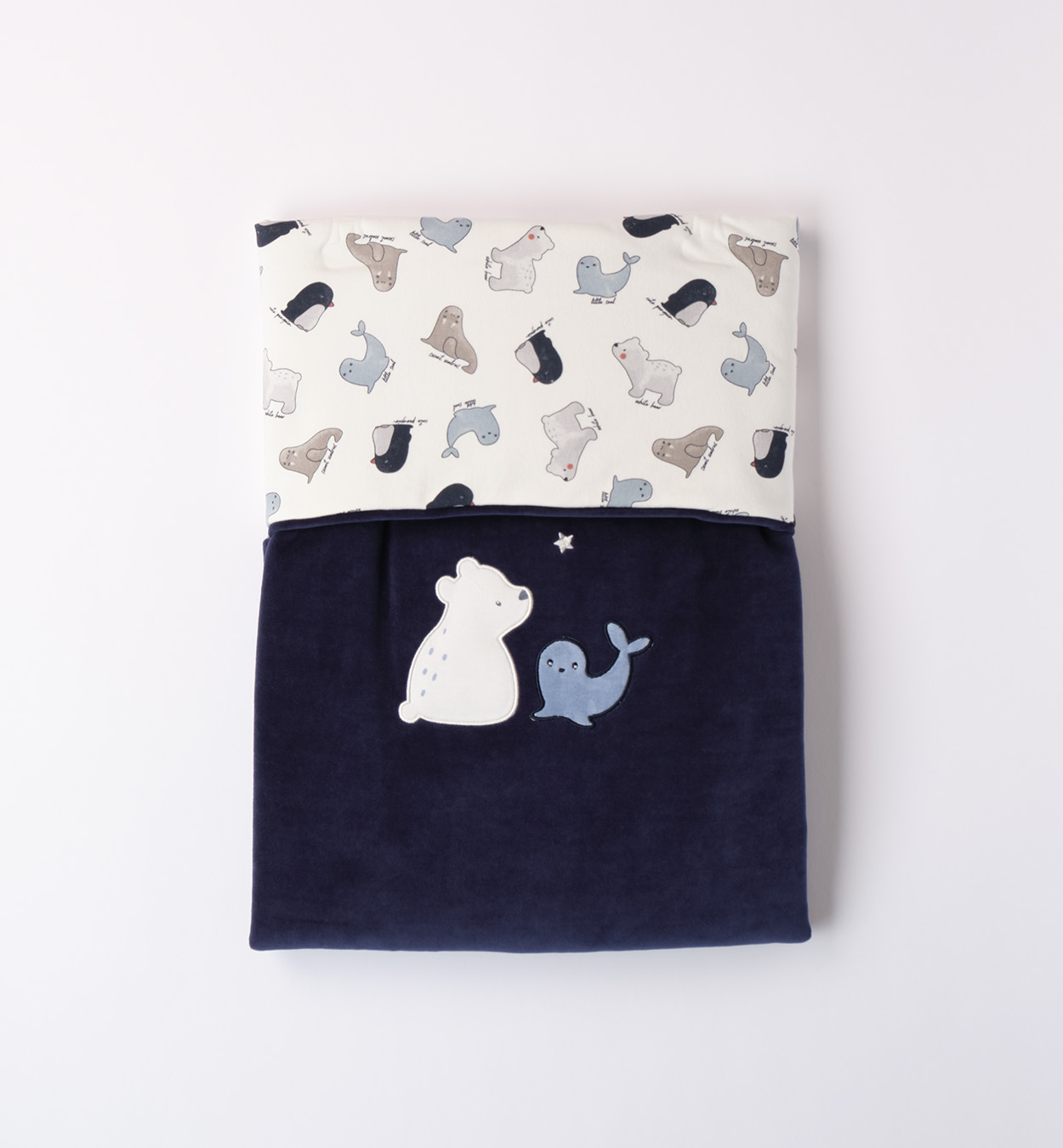 Copertina per culla/carrozzina in ciniglia imbottita colore blu con ricamo foca e orsetto. Parte posteriore a fantasia animaletti blu, celeste e grigio perla.