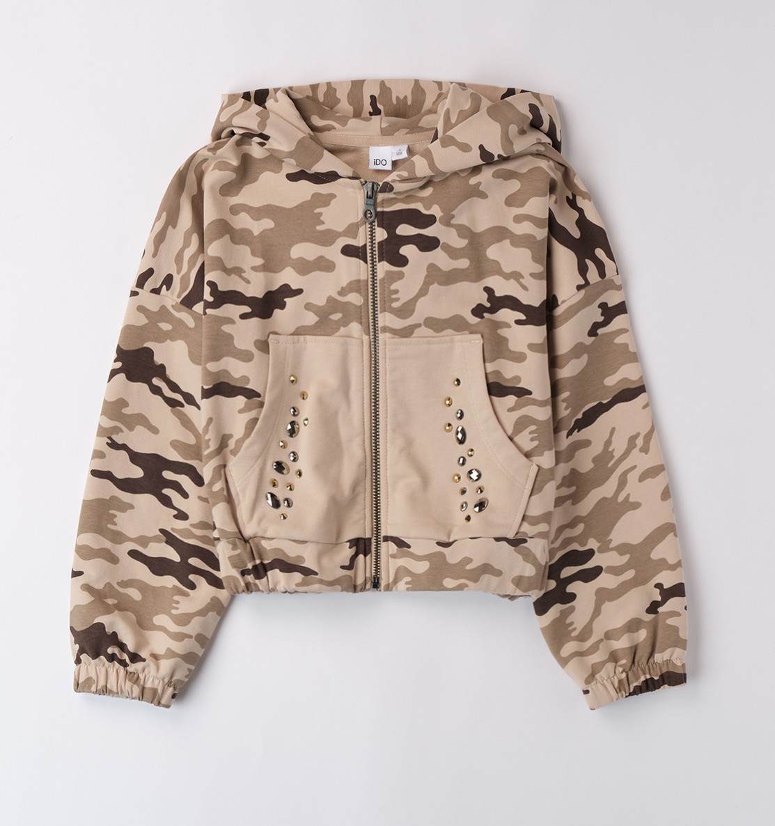 Felpa ragazzina con zip e cappuccio realizzata in felpa garzata invernale fantasia mimetica con tasche beige impreziosita da strass e borchiette sulle tasche.