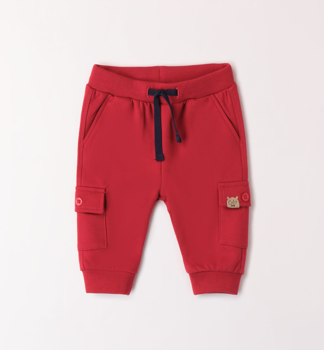 Pantalone baby maschio in felpa stretch rossa tipo tuta con tasche laterali sulle ginocchia e pratico laccio regolabile in vita.
