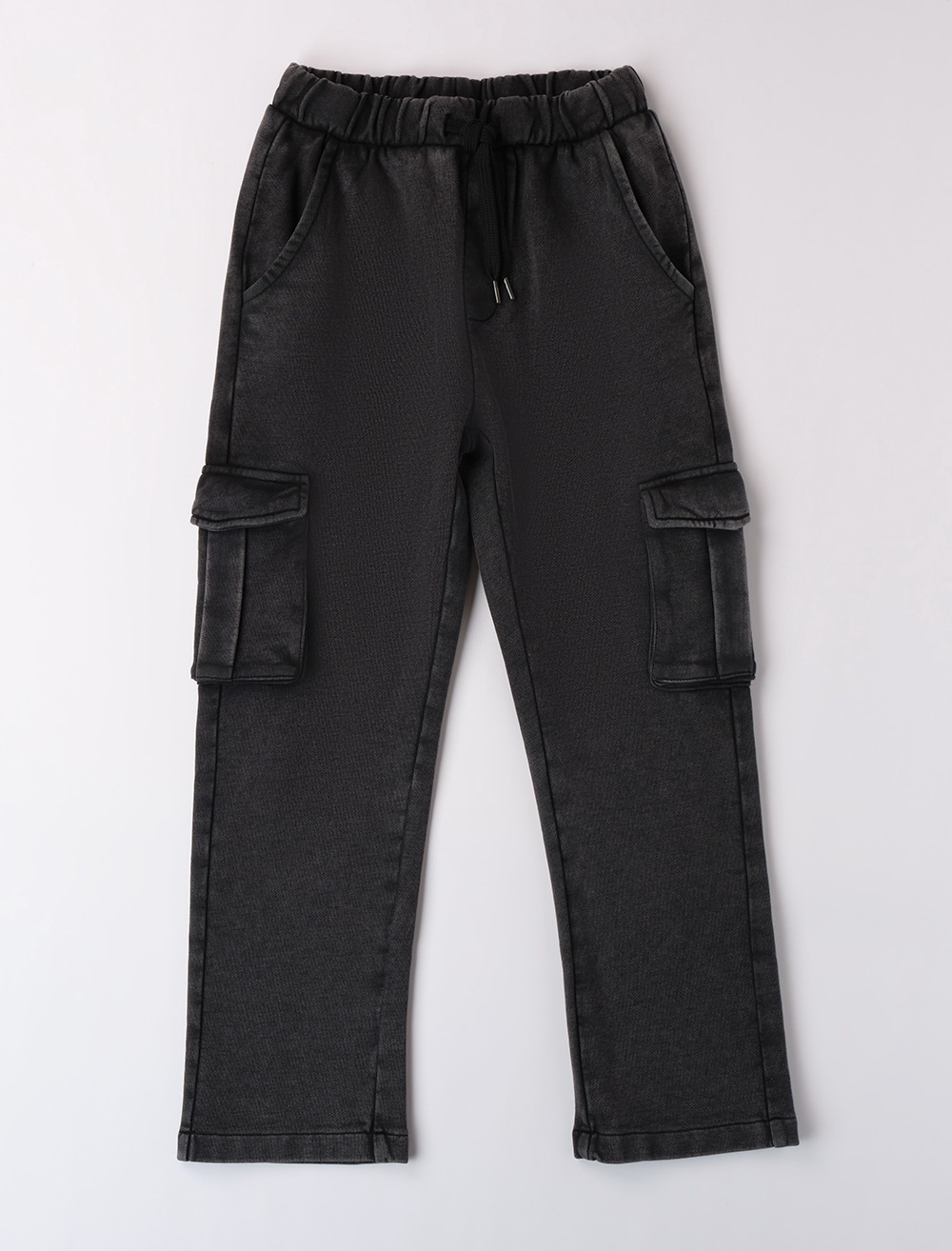 Pantalone ragazzino in felpa nera tipo “Cargo” con tasconi laterali e pratico laccio regolabile in vita.