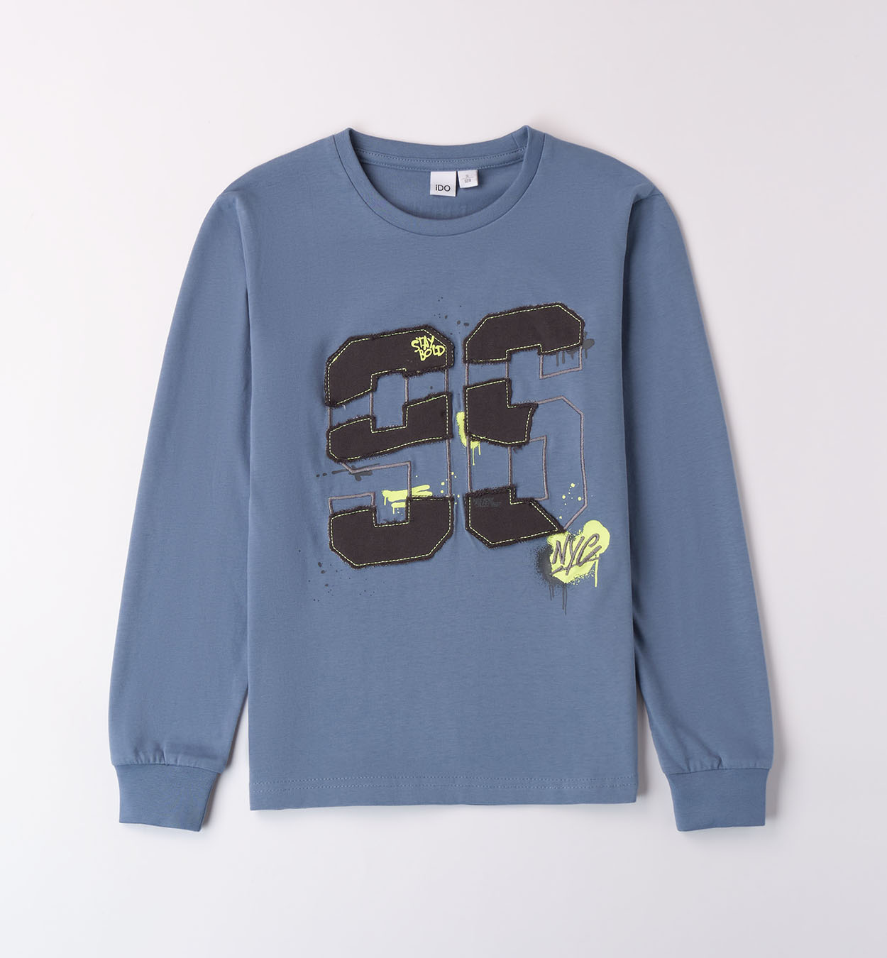 T-shirt ragazzino in caldo cotone color carta da zucchero con numero grigio piombo e giallo in parte applicato e in parte stampato.