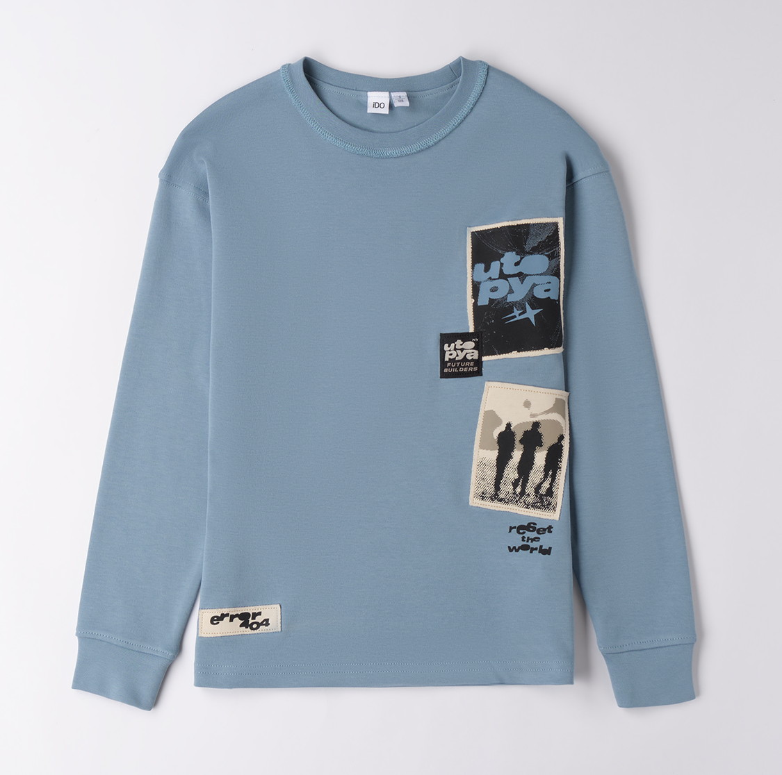 T-shirt ragazzino in caldo cotone celeste con applicazioni e stampe etichette sui toni del blu, bianco e beige.