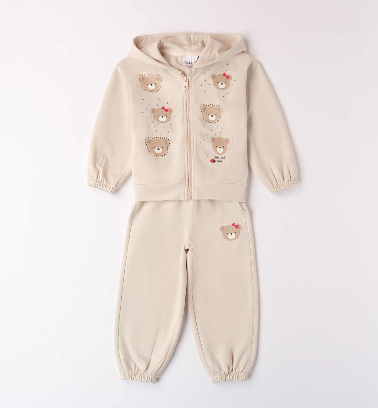 Tuta bimba in felpa stretch invernale color sabbia con felpa con zip e cappuccio decorata con stampa orsetti beige, strass rosati e fiocchetti color ciliegia. Pantalone con pratico laccio regolabile in vita.