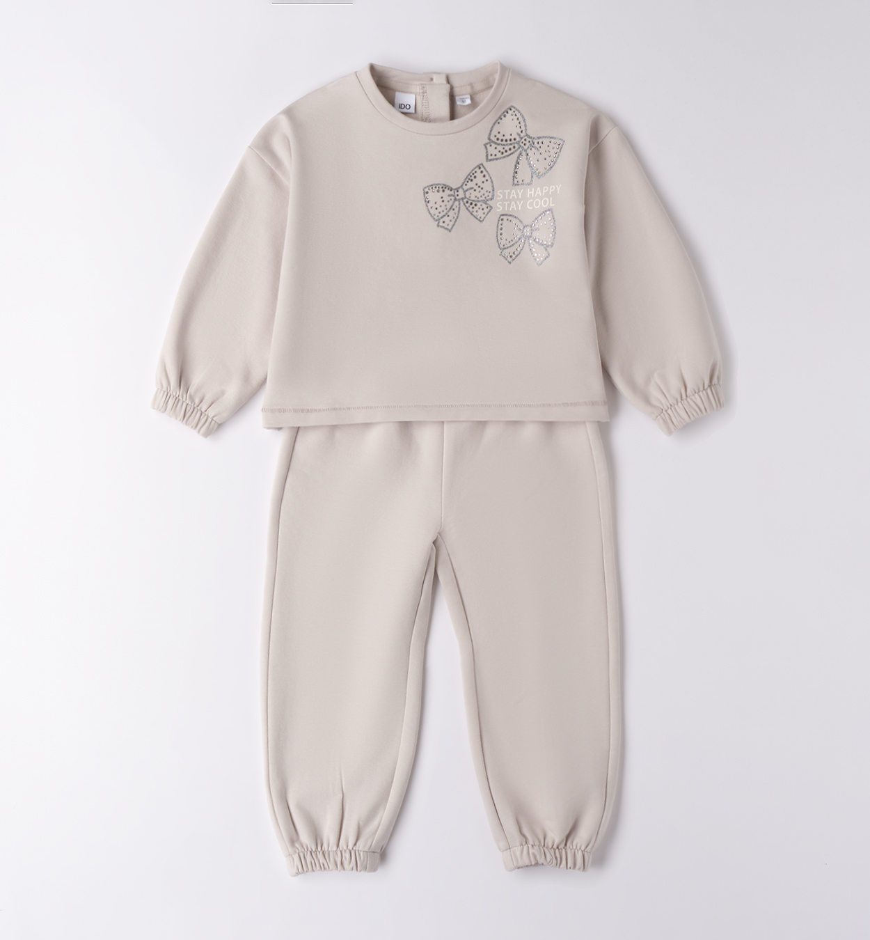 Tuta bimba in felpa stretch invernale color ghiaccio con felpa a girocollo decorata da fiocchi strass e dettagli glitter. Pantalone con pratico laccio regolabile in vita.
