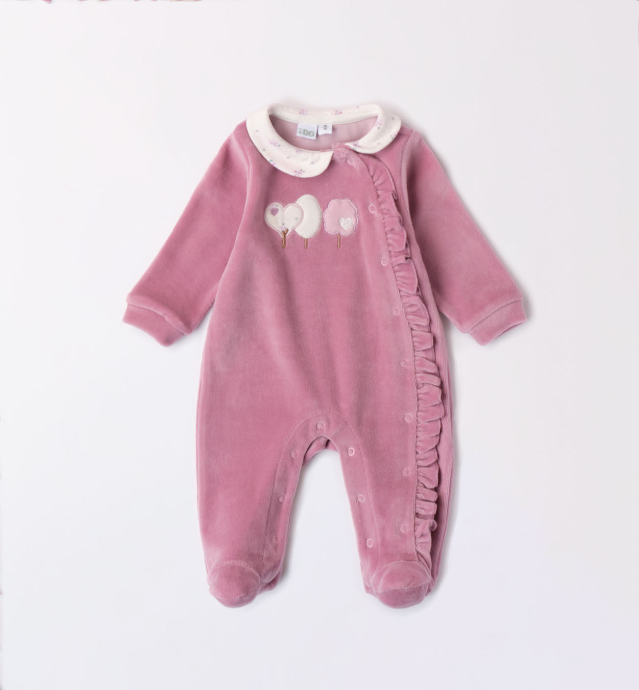Tutina neonata in ciniglia colore rosa acceso con applicazione alberelli, colletto bianco a fiorellini rosa e grazioso volant. Comoda apertura frontale e sull’interno della gambina.