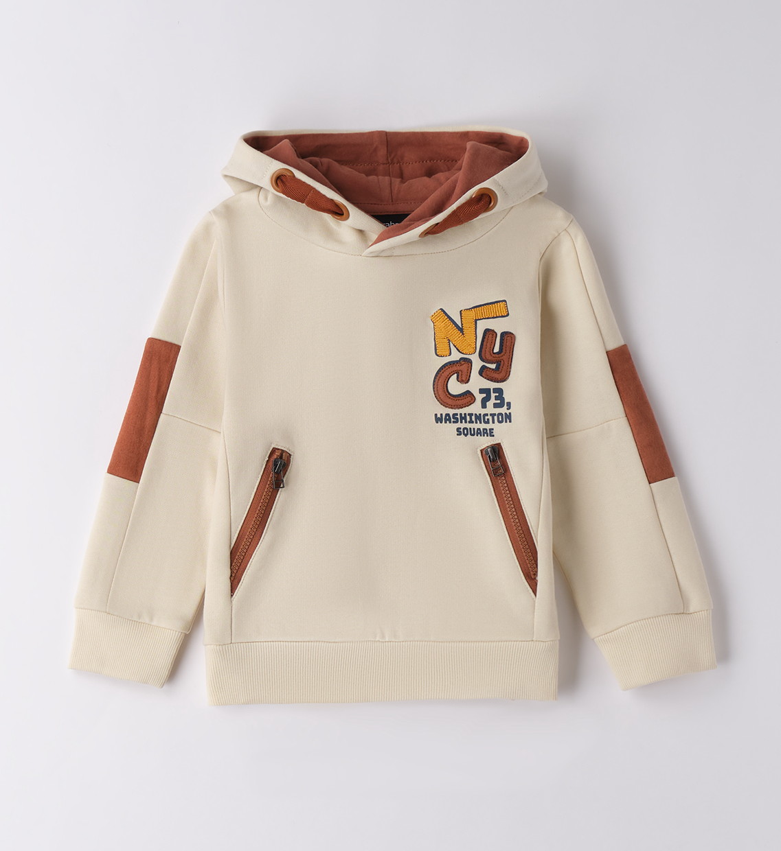 Felpa bimbo girocollo con cappuccio in felpa color ecrù con inserti e rifiniture color tabacco e piccola stampa gialla, blu e tabacco.