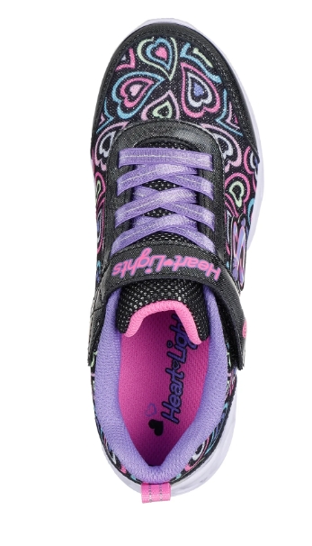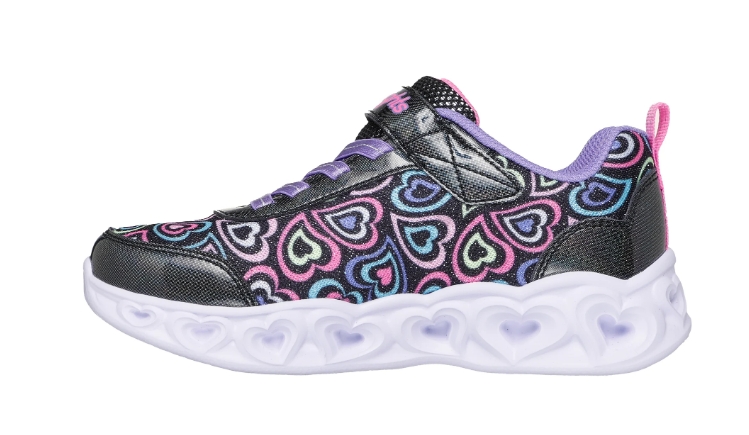 Sneaker bimba con velcro e lacci elastici realizzata in materiale tecnico scintillante nero con stampa cuori multicolor. Intersuola luminosa lampeggiante con elementi scolpiti a forma di cuore con interruttore on/off. Suola flessibile, comodo plantare imbottito e ammortizzato.